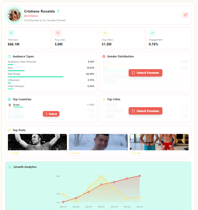 Stop guessing, start growing. Get a deep, data-driven analysis of any Instagram profile—engagement rate, audience demographics, and fake follower detection.